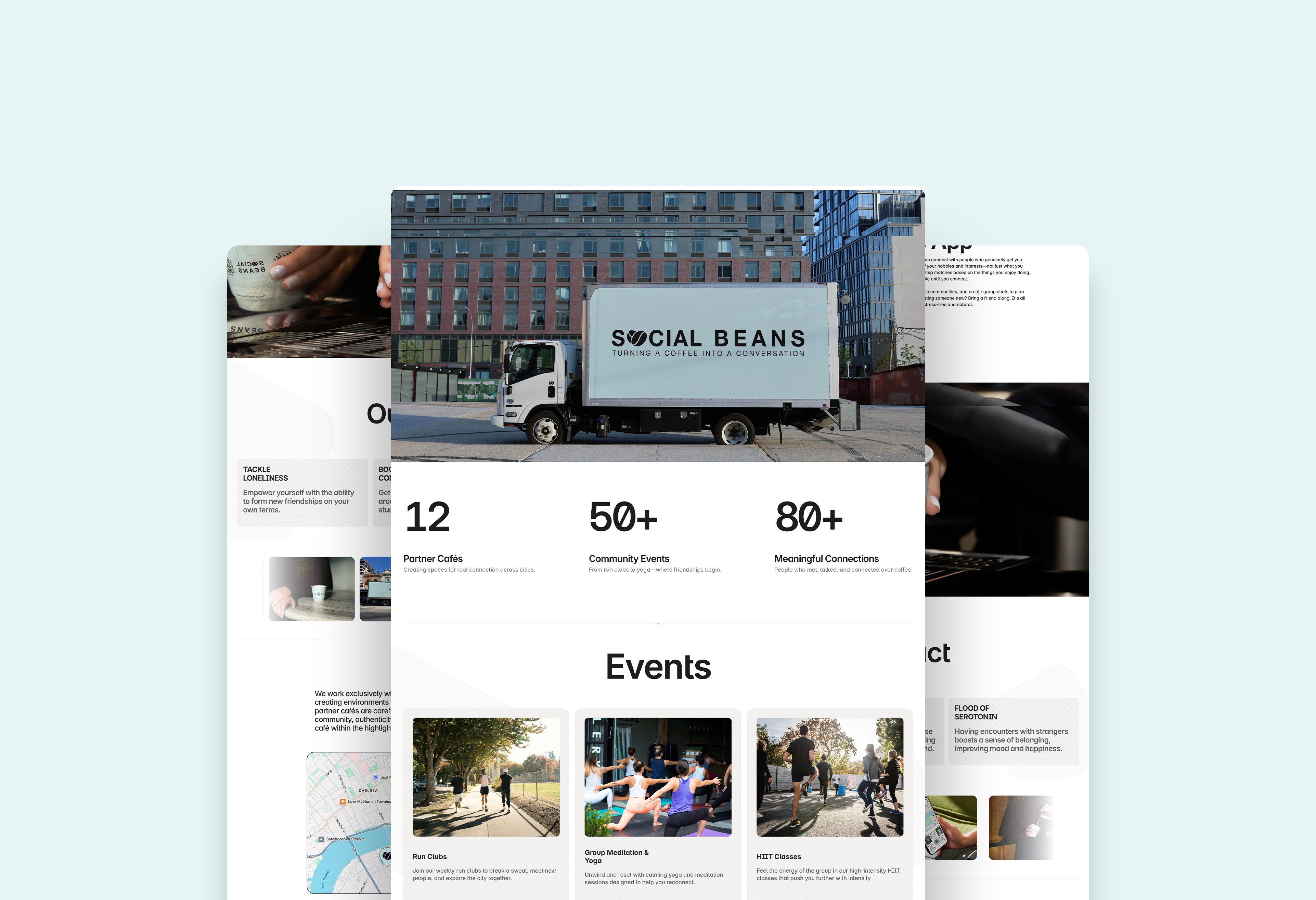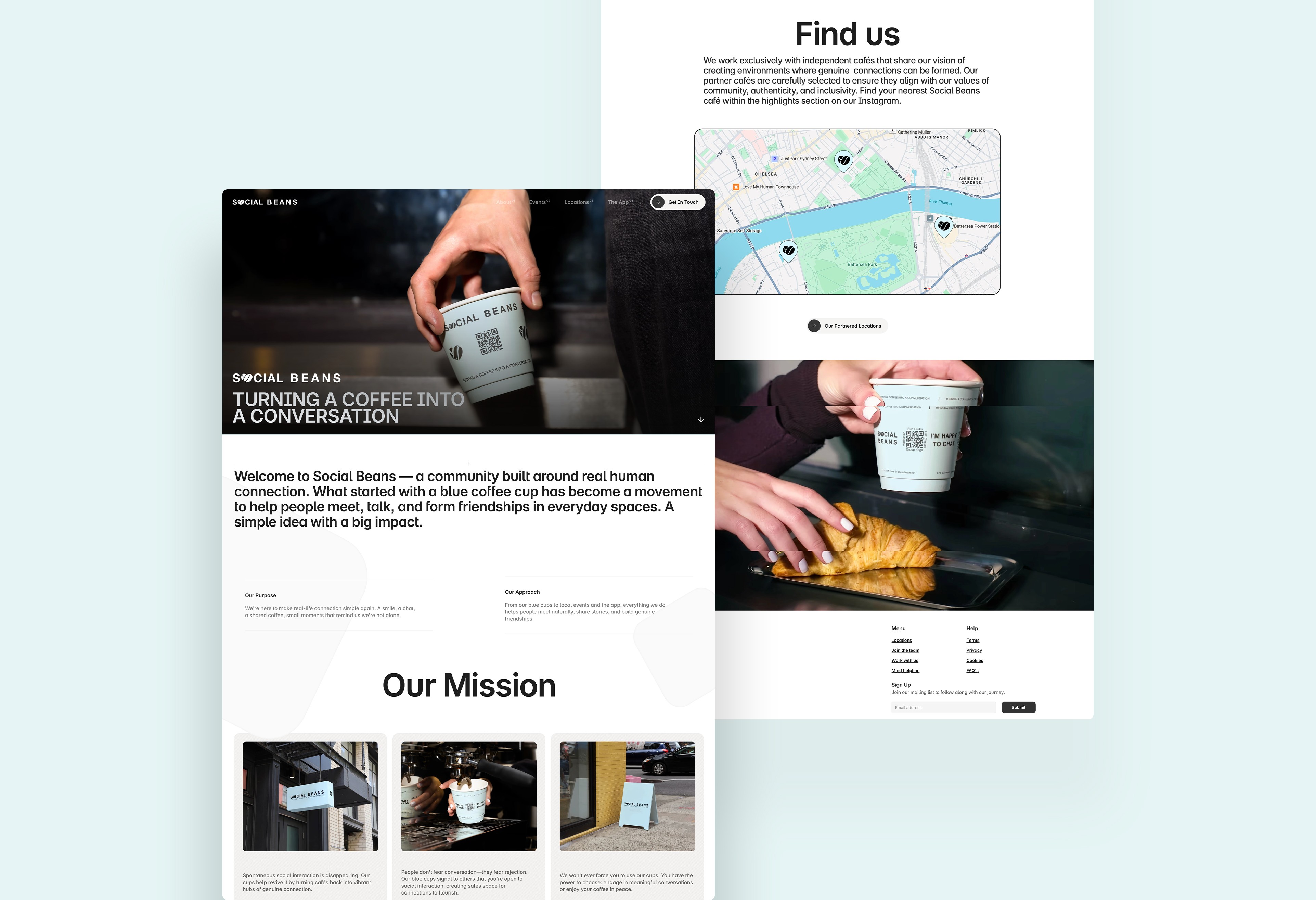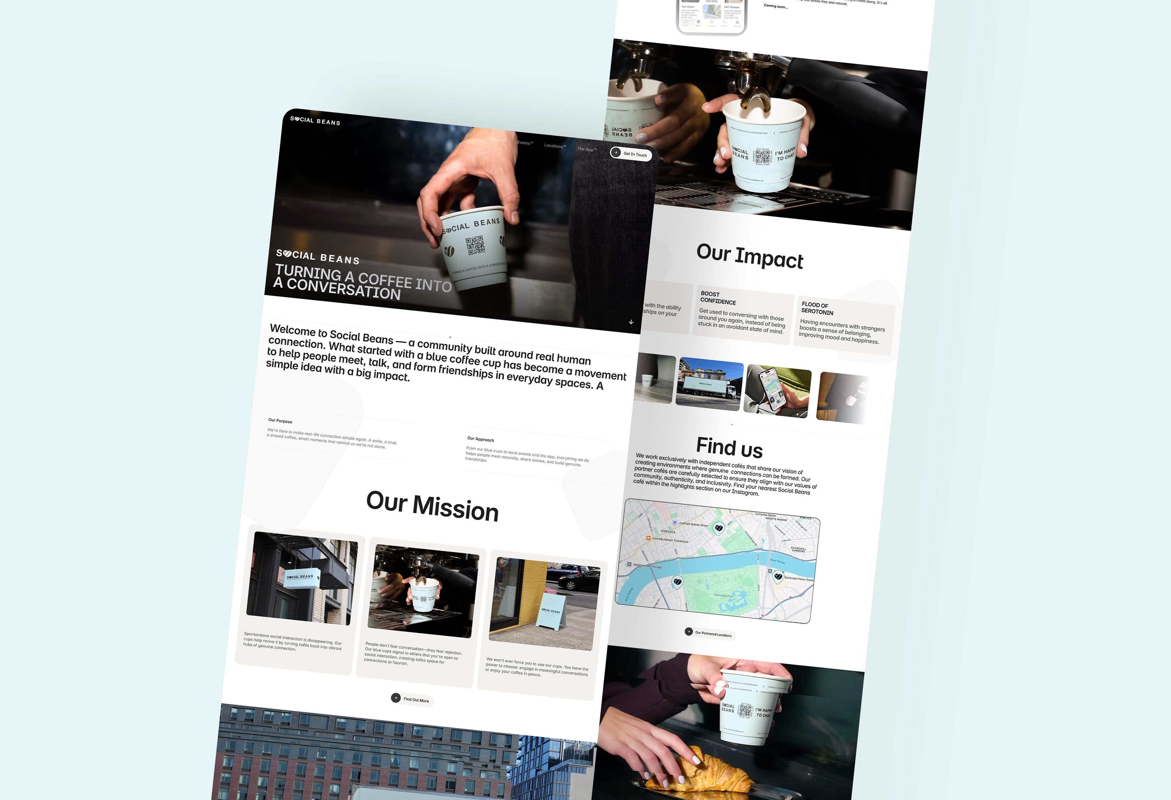 The final result is a modern and welcoming website that clearly communicates the purpose and impact of Social Beans. The platform helps visitors quickly understand the concept, discover community events, explore locations, and connect with the initiative through the app. By combining storytelling with structured navigation, the website strengthens the movement’s visibility and encourages real-world participation.